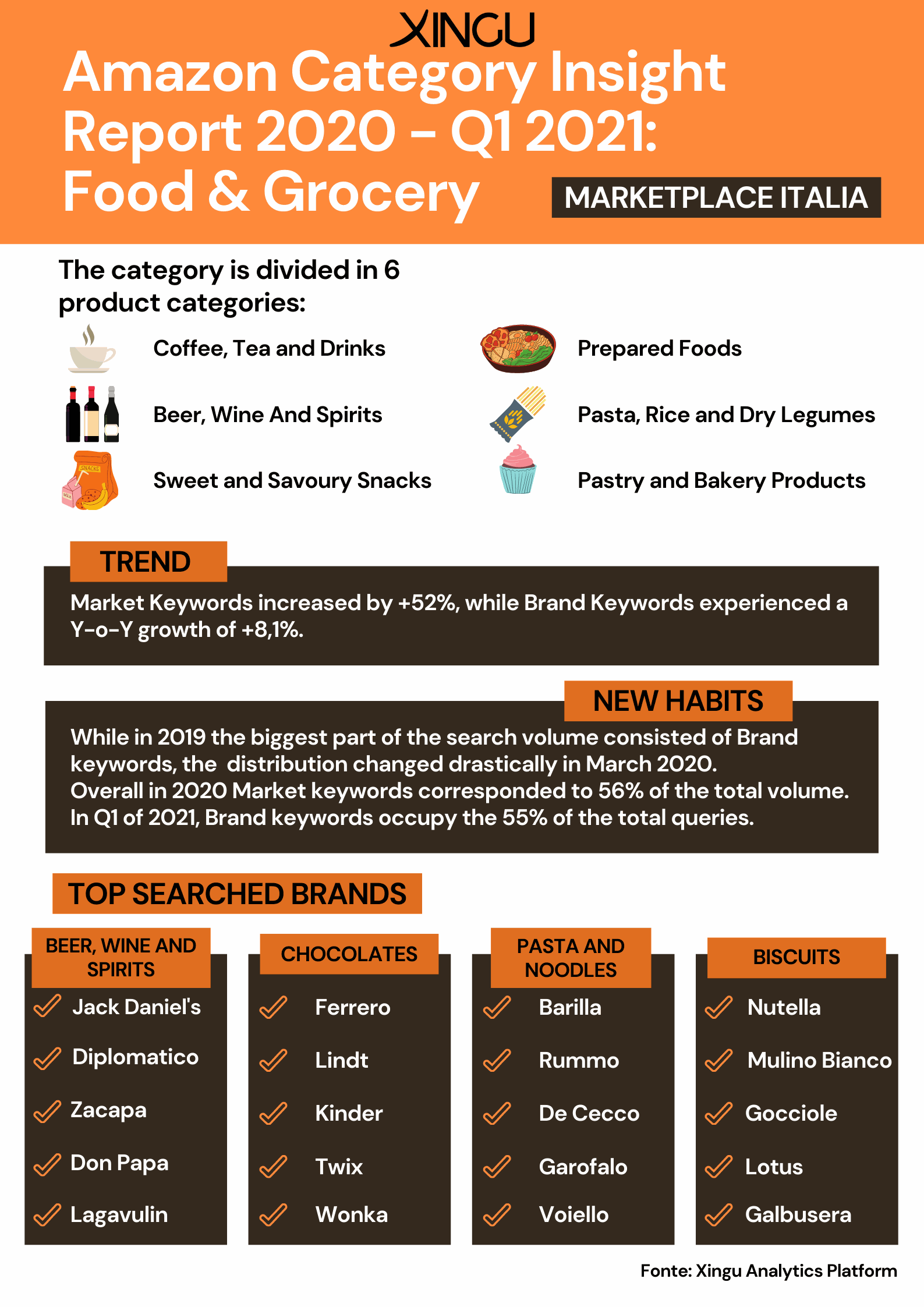 Amazon Category Insight Report 2020 - Q1 2021 per la categoria Food & Grocery! Il report offre un'overview completa della categoria e dei suoi trend durante il 2020 e il primo quarter del 2021. Tutte le sottocategorie sono analizzate nel dettaglio, individuando trend, keyword e brand maggiormente ricercati dagli utenti.